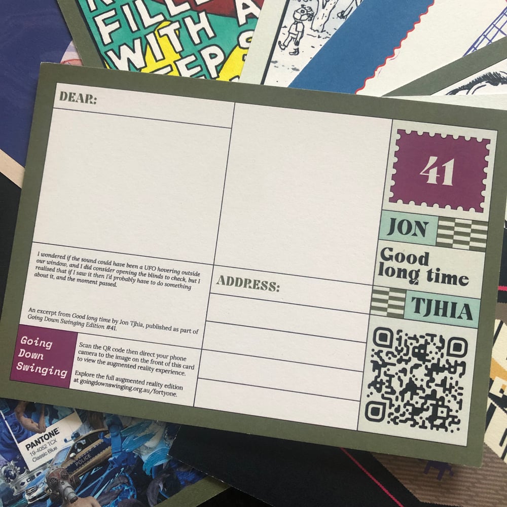 Going Down Swinging Edition #41 showcases the work of ten writers and artists in a boundary-pushing, augmented reality-enabled digital edition. While you’ll be able to run your eyeballs over the complete digital edition on our website, we’ve also printed a limited edition run of postcards that’ll bring the Edition #41 augmented reality art direct to your house.